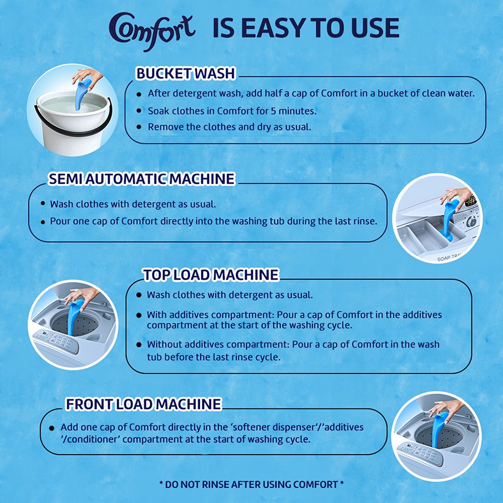 - Only detergent is not enough - comfort is a small step after wash that coats each cloth fibre with a protective layer and prevents the damage caused by repeated washing